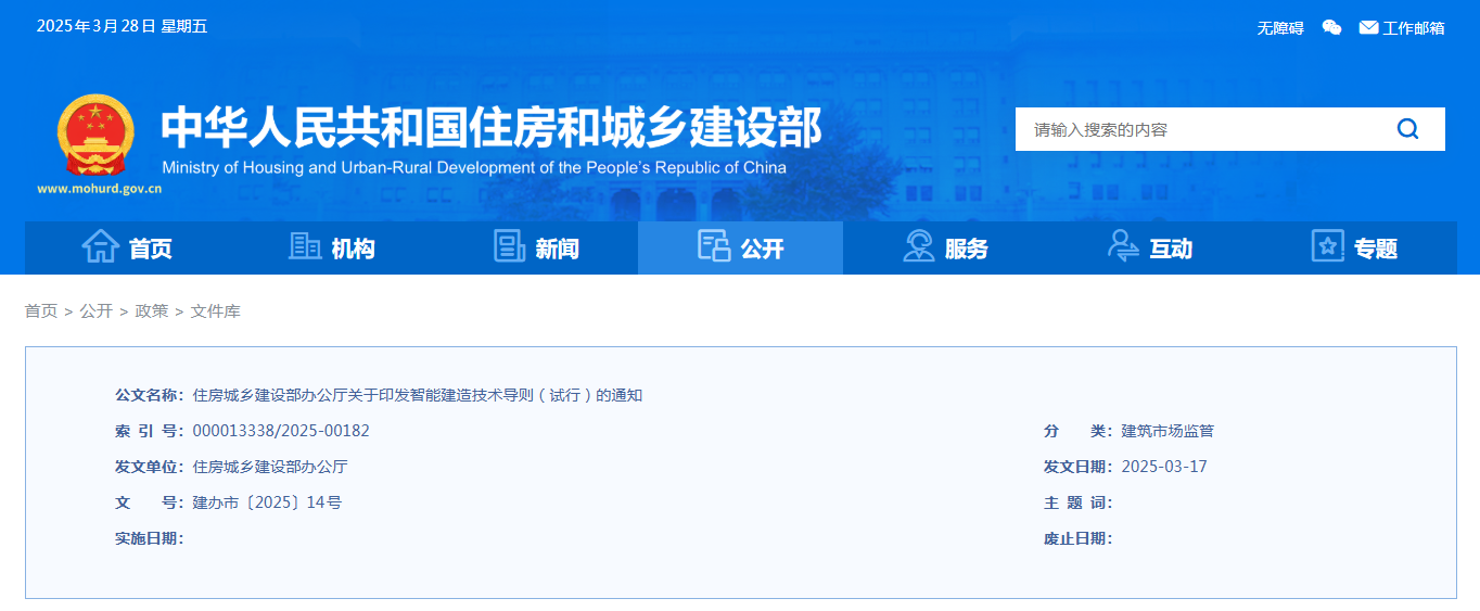 為貫徹落實《中共中央辦公廳、國務院辦公廳關于推進新型城市基礎設施建設打造韌性城市的意見》等文件要求,加快推進智能建造技術在工程建設全生命期應用,推動建筑業(yè)高質量發(fā)展,住房城鄉(xiāng)建設部組織編制了《智能建造技術導則(試行)》。現印發(fā)給你們,請結合實際參照執(zhí)行。